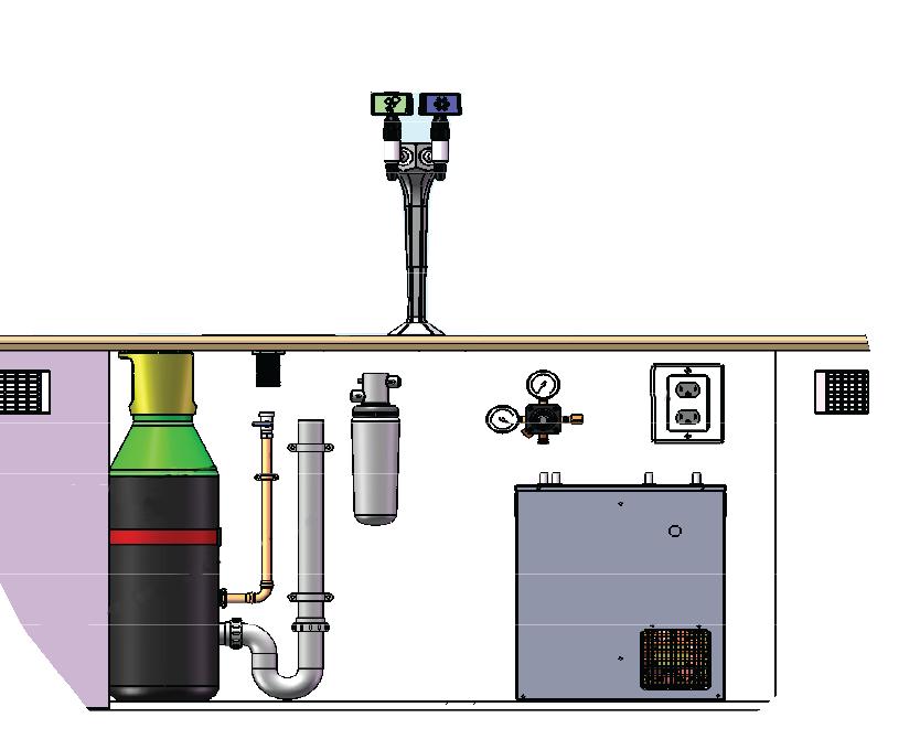 If connecting to a bulk or existing CO2 system, a CO2 line terminating at a ¼” barbed shutoff valve must be available within 40” of the System installation site, 100psi minimum pressure. 20 lbs CO2 cylinder recommended to fit inside cabinet of unit.