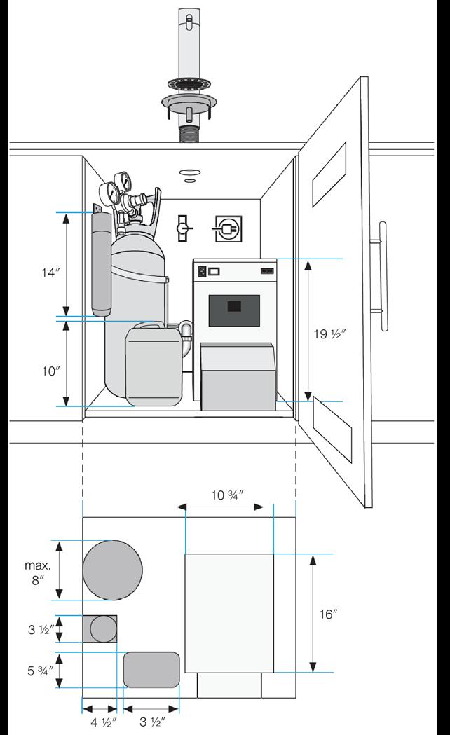 If connecting to a bulk or existing CO2 system, a CO2 line terminating at a ¼″ barbed shutoff valve must be available within 40″ of the System installation site, 100psi minimum pressure. 20 lbs CO2 cylinder recommended to fit inside cabinet of unit.