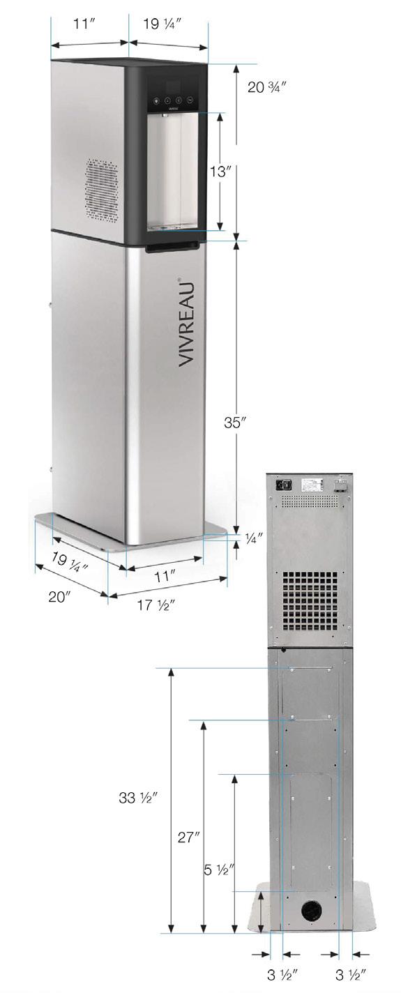 Vivreau High Volume Water Bottling System, dual tap, freestanding cabinet, self-contained ice bank refrigeration system, advanced micro-filtered, chilled still and sparkling water, twin tap with removable nozzles & stainless steel drip tray, accommodates up to 20 lb CO2 cylinder (cylinder not included), front feet, rear rollers, x1 20amp electrical receptacle (5-20 R) 120V 60Hz (11 amps), NEMA 5-20R, ETL, NSF (for indoor use only)