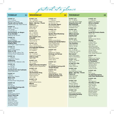 1 – 2:30 pm Waterfront Theatre La Joie de Lire Un nouveau départ Sylvie Desrosiers Martine Noël-Maw 1 – 2:30 pm PTC Studio Spoken Word Workshop Miles Merrill Event #19