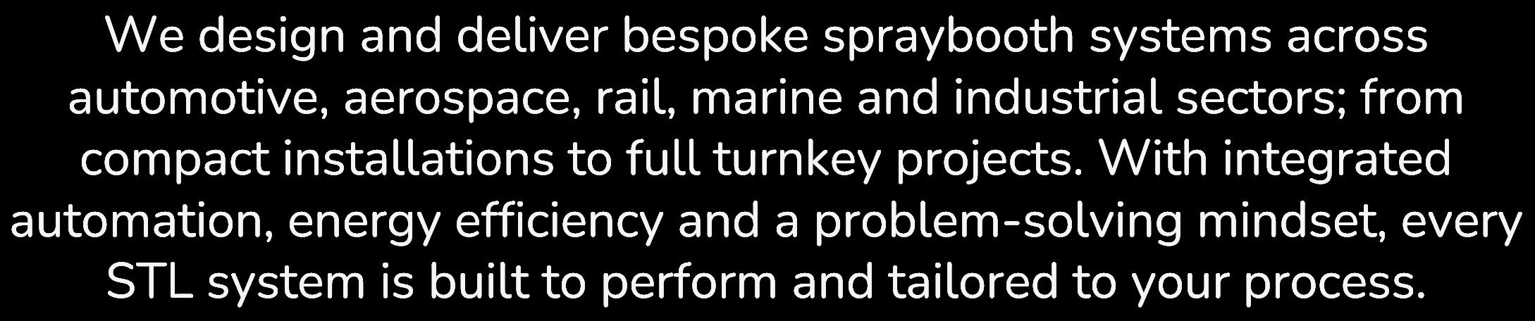 We are Spraybooth Technology Limited (STL), delivering advanced spraybooth and finishing solutions since 1993. From in-house design to full turnkey delivery and automation integration, we serve automotive, aerospace, industrial, rail, and marine sectors. Constructionline Gold-certified, we combine technical expertise withprovenreliability across complex, high-performance environments.