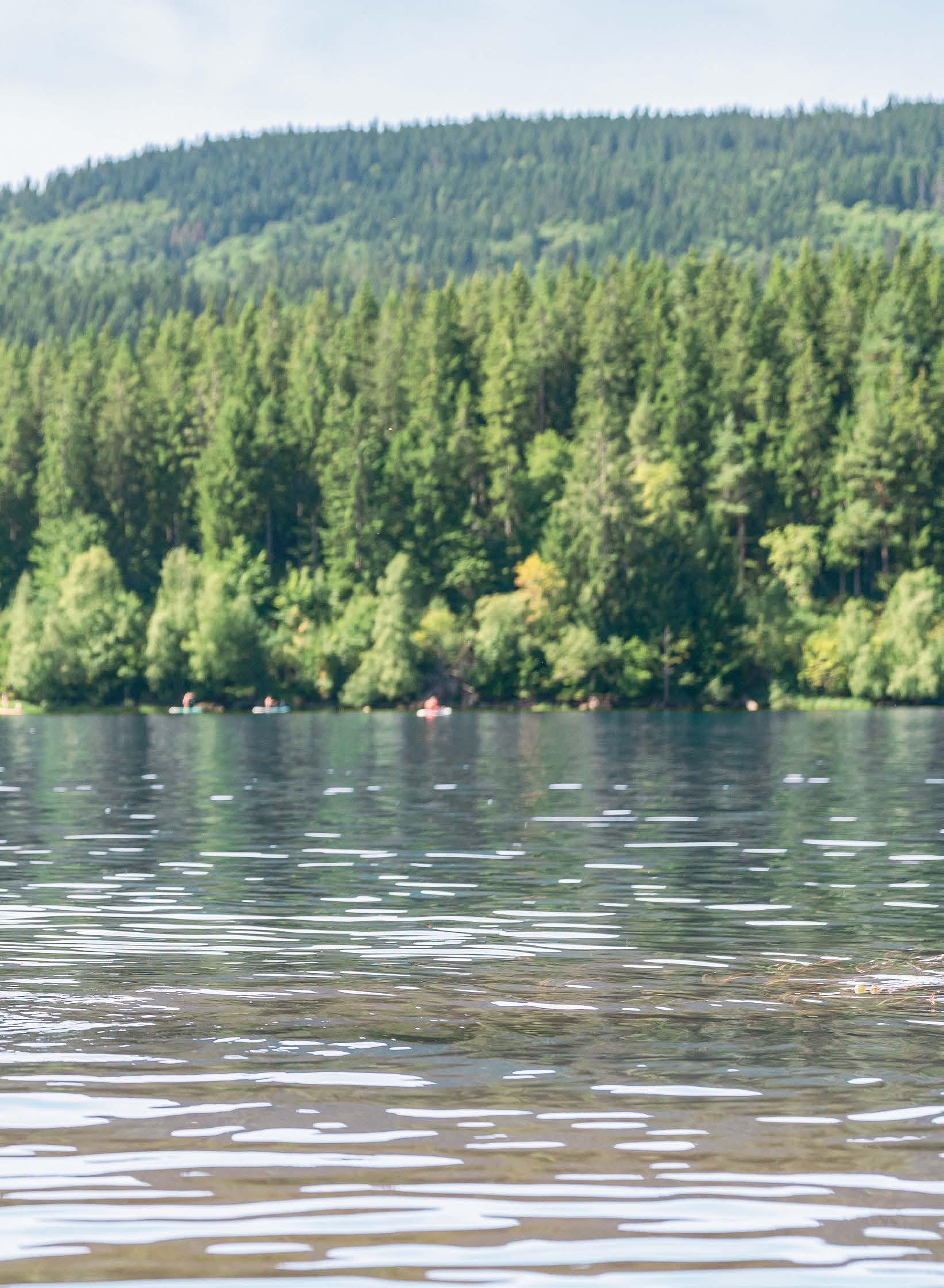Alternativ lockt auch der Naturerlebnispfad zum Schlüchtsee . Eine kleine, kinderwagengerechte Route durch den Schlüchtsee-Hüsli-Wald-Naturpark – ab dem Wanderparkplatz in Rothaus – zum Schlüchtsee bei Grafenhausen. Der 2,6 Kilometer lange Rundweg begeistert auch die Kids. Säumen doch Spiel stationen und handgeschnitzte Holzfi guren den Weg, und der Badestrand mit fl ach abfallendem Ufer ist perfekt zum Planschen und Baden.