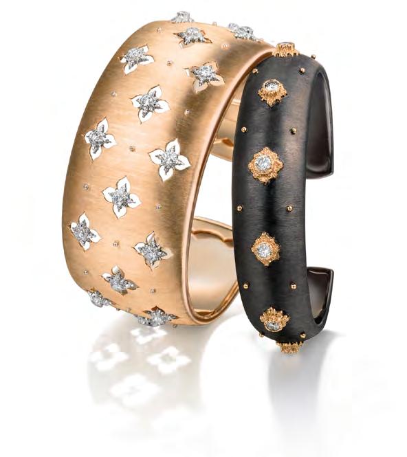 “More is more” becomes the fashion credo of the era, with jewelry turning ultraglamorous and unapologetically flashy. Ornate necklaces, bold statement earrings, and multi-strand pearl collars dominate the scene. From Elizabeth Taylor’s dazzling jewels to the opulent style of Dynasty, diamonds are everywhere—and consumers can’t get enough. Big studs, sleek tennis bracelets, and wide gold-and-diamond cuffs are all the rage, now accessible at every budget. Meanwhile, Buccellati explores new materials such as enamel, creating lively and transgressive bangle bracelets and cuffs that push the boundaries of traditional design.