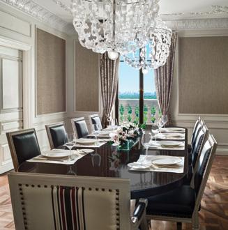 The dramatic Imperial Suite features European Chinoisere and East Asian furnishings set against alluring red tones with crystal accents. Mixed stylistic influences and a reinvented open floor plan lend a residential flow to the space, while plush window seats offer both stunning views of Manhattan to Central Park, and serve as cozy havens for retreat. A formal dining room and full kitchen ensure a memorable private meal.