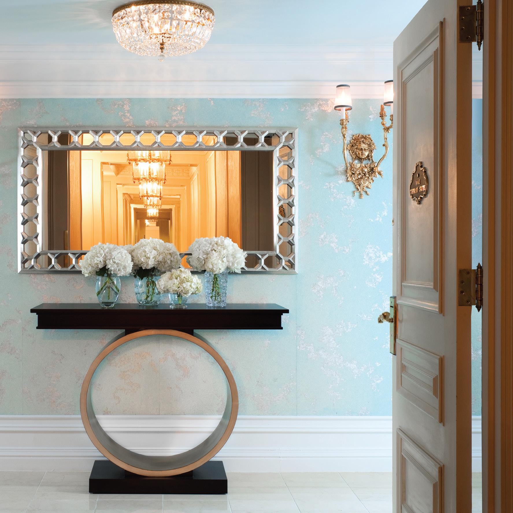 Inspired by Gilded Age doyenne and matriarch of St. Regis, the luxurious Caroline Astor Suite offers a serene and sophisticated escape overlooking views of Central Park. The 1,700 sq. foot suite features a cool color palette of bright whites, beige, charcoal gray and silver pale blue tones. Both whimsical and luxurious, the suite reflects a modern aesthetic and contemporary vision within the deeply elegant walls of The St. Regis New York.