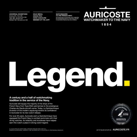 Legend. A century and a half of watchmaking tradition in the service of the Navy. Auricoste still equips the majority of the ships of the French Navy from Type SNA submarines to the prestigious Charles-de-Gaulle aircraft carrier. Today, La Spirotechnique (inventor of the modern aqualung) renews its confidence in Auricoste for its new watch release. For over 20 years, Auricoste and La Spirotechnique have equipped the French Navy’s combat swimmers with their diving watches. Its reliability and sturdiness have helped earn this watch a place in diving watch legend. ALL BLACK PVD/LDC COATED MODEL, BRUSHED STAINLESS STEEL CASE 316 L, DIAMOND POLISHED BEZEL. DIAMETER: 42 MM, DELIVERED WITH A COLLECTION OF 3 PROFESSIONAL BRACELETS.