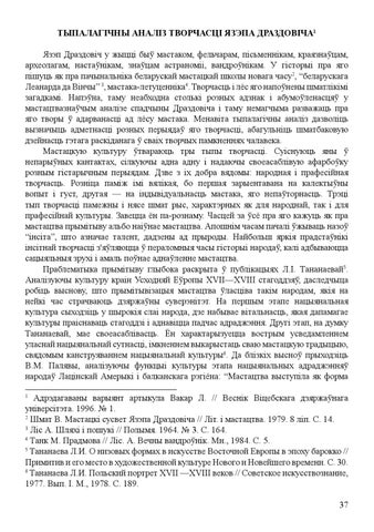 ТЫПАЛАГІЧНЫ АНАЛІЗ ТВОРЧАСЦІ ЯЗЭПА ДРАЗДОВІЧА1 Язэп Драздовіч у жыцці быў мастаком, фельчарам, пісьменнікам, краязнаўцам, археолагам, настаўнікам, знаўцам астраноміі, вандроўнікам. У гісторыі пра яго пішуць як пра пачынальніка беларускай мастацкай школы новага часу2, “беларускага Леанарда да Вінчы” 3, мастака-летуценніка4. Творчасць і лёс яго напоўнены шматлікімі загадкамі. Напэўна, таму неабходна столькі розных адзнак і абумоўленасцяў у мастацтвазнаўчым аналізе спадчыны Драздовіча і таму немагчыма разважаць пра яго творы ў адарванасці ад лёсу мастака. Менавіта тыпалагічны аналіз дазволіць вызначыць адметнасці розных перыядаў яго творчасці, абагульніць шматбаковую дзейнасць гэтага раскіданага ў сваіх творчых памкненнях чалавека. Мастацкую культуру ўтвараюць тры тыпы творчасці. Суіснуюць яны ў непарыўных кантактах, сілкуючы адна адну і надаючы своеасаблівую афарбоўку розным гістарычным перыядам. Дзве з іх добра вядомы: народная і прафесійная творчасць. Розніца паміж імі вялікая, бо першая зарыентавана на калектыўны вопыт і густ, другая — на індывідуальнасць мастака, яго непаўторнасць. Трэці тып творчасці памежны і нясе шмат рыс, характэрных як для народнай, так і для прафесійнай культуры. Завецца ён па-рознаму. Часцей за ўсё пра яго кажуць як пра мастацтва прымітыву альбо наіўнае мастацтва. Апошнім часам пачалі ўжываць назоў “інсіта”, што азначае талент, дадзены ад прыроды. Найбольш яркія прадстаўнікі інсітнай творчасці з'яўляюцца ў пераломныя часы гісторыі народаў, калі адбываюцца сацыяльныя зрухі і амаль поўнае аднаўленне мастацтва. Праблематыка прымітыву глыбока раскрыта ў публікацыях Л.І. Тананаевай5. Аналізуючы культуру краін Усходняй Еўропы ХVІІ—ХVІІІ стагоддзяў, даследчыца робіць выснову, што прымітывізацыя мастацтва ўласціва такім народам, якія на нейкі час страчваюць дзяржаўны суверэнітэт. На першым этапе нацыянальная культура сыходзіць у шырокія слаі народа, дзе набывае вітальнасць, якая дапамагае культуры праіснаваць стагоддзі і аднавіцца падчас адраджэння. Другі этап, на думку Тананаевай, мае своеасаблівасць. Ён характарызуецца вострым усведамленнем уласнай нацыянальнай сутнасці, імкненнем выкарыстаць сваю мастацкую традыцыю, свядомым канструяваннем нацыянальнай культуры6. Да блізкіх высноў прыходзіць В.М. Палявы, аналізуючы функцыі культуры этапа нацыянальных адраджэнняў народаў Лацінскай Амерыкі і балканскага рэгіёна: “Мастацтва выступіла як форма Адрэдагаваны варыянт артыкула Вакар Л. // Веснік Віцебскага дзяржаўнага універсітэта. 1996. № 1. 2 Шмат В. Мастацкі сусвет Язэпа Драздовіча // Літ. і мастацтва. 1979. 8 ліп. С. 14. 3 Ліс А. Шляхі і пошукі // Полымя. 1964. № 3. С. 164. 4 Танк М. Прадмова // Ліс. А. Вечны вандроўнік. Мн., 1984. С. 5. 5 Тананаева Л.И. О низовых формах в искусстве Восточной Европы в эпоху барокко // Примитив и его место в художественной культуре Нового и Новейшего времени. С. 30. 6 Тананаева Л.И. Польский портрет ХVІІ —ХVІІІ веков // Советское искусствознание, 1977. Вып. І. М., 1978. С. 189. 1
