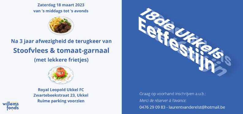 OCMW-voorzitter Stefan Cornelis, gemeenteraadslid Jean-Luc Vanraes en voorzitter Laurent Van der Elst verwelkomen u op hun 18e eetfestijn met het lekkerste stoofvlees van Brussel en tomaat-garnaal. ZA 18 maart - ‘s middags tot ‘s avondslaurentvanderelst@hotmail.be