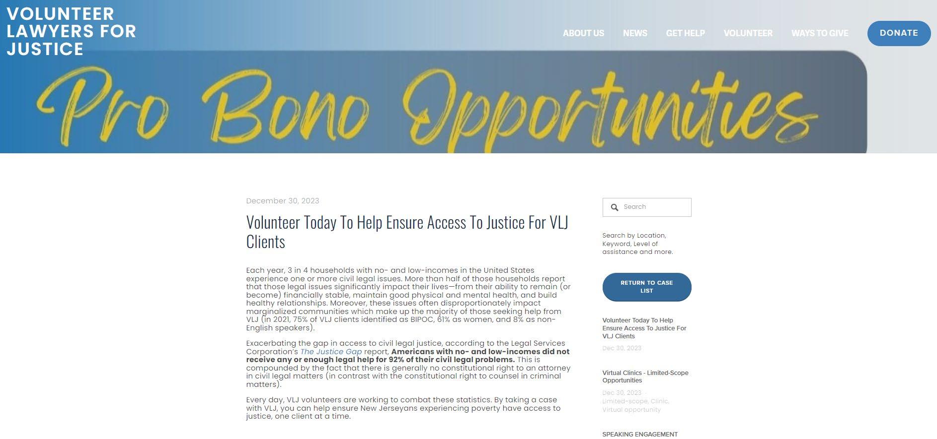 VLJ was founded in 2001 to provide direct legal representation to the residents of Essex County, New Jersey. Today, the organization has 8 pro bono programs, 25 trustees, a panel of hundreds of volunteers, and many donors all working together to ensure justice is available to everyone, regardless of their income.