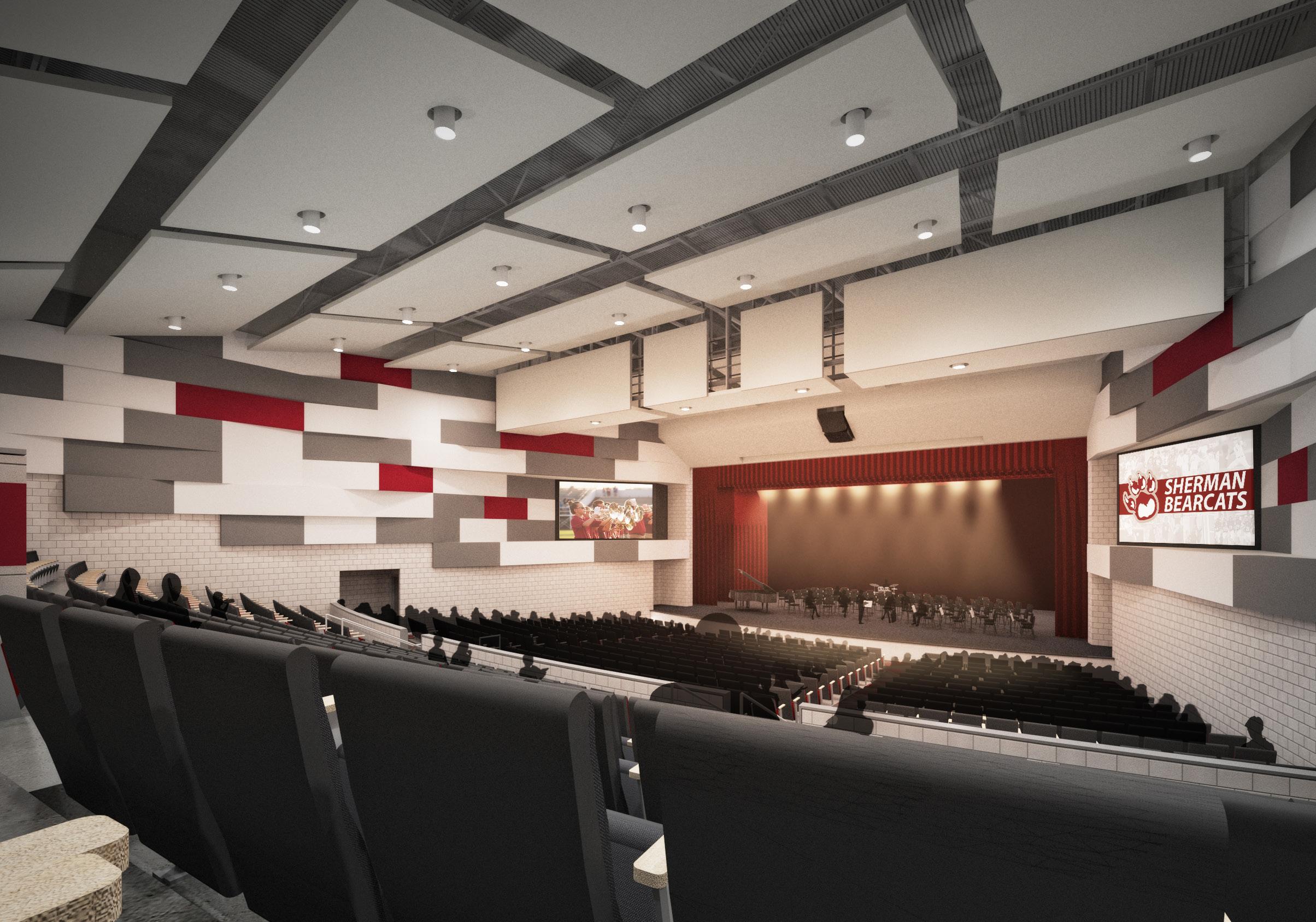 The Fine Arts at Sherman High School will feature a dedicated entrance to this area. It will include an auditorium, band, orchestra, and choir facilities, as well as an art classroom with outdoor access. There will also be a number of practice rooms that will be shared across multiple groups.