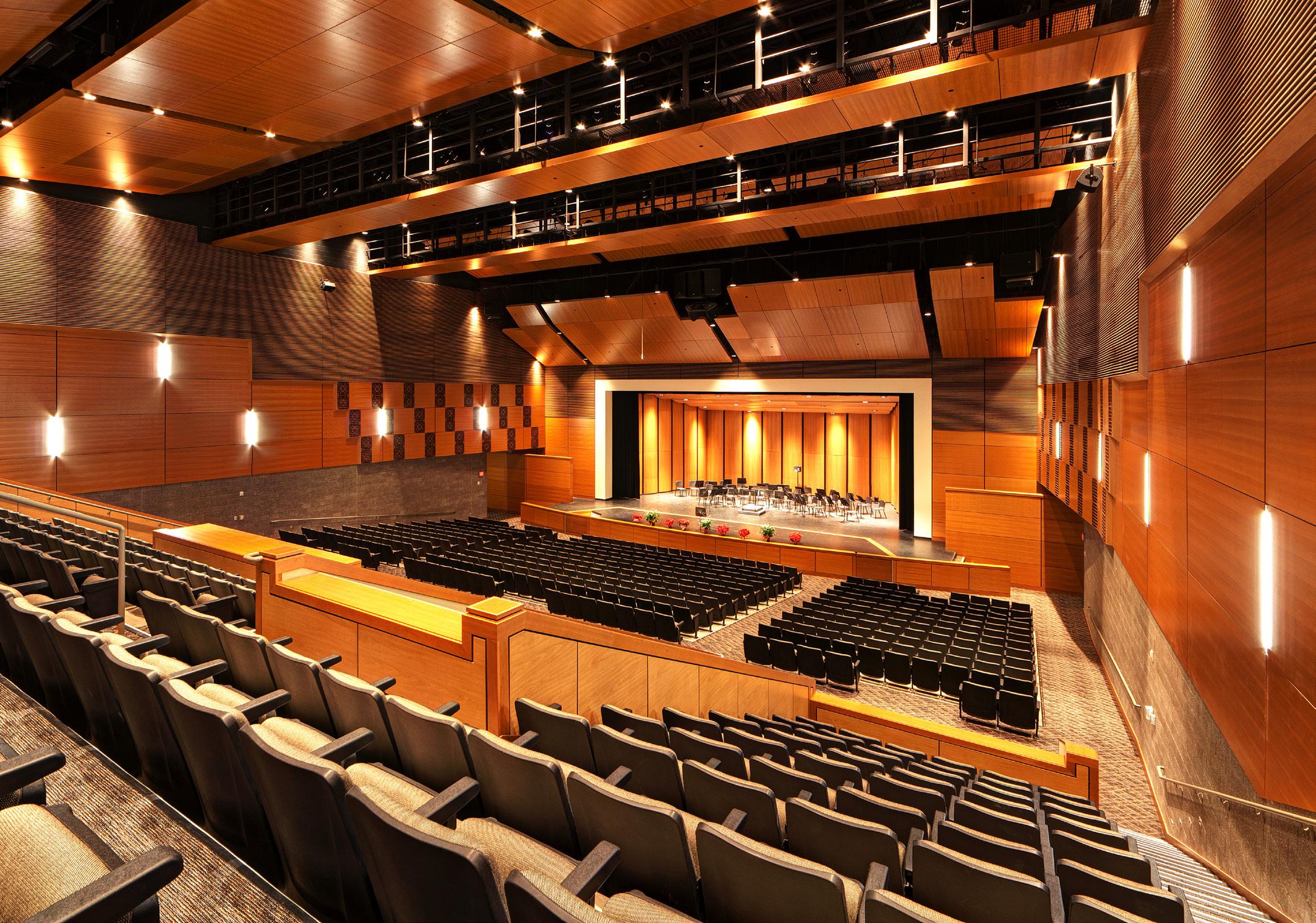 The 1,000-seat auditorium is laid out in a four aisle configuration. The steeply raked seating improves sight lines and creates additional storage area under the seating. A unique feature in this project is the open sound booth in the center of the auditorium.
