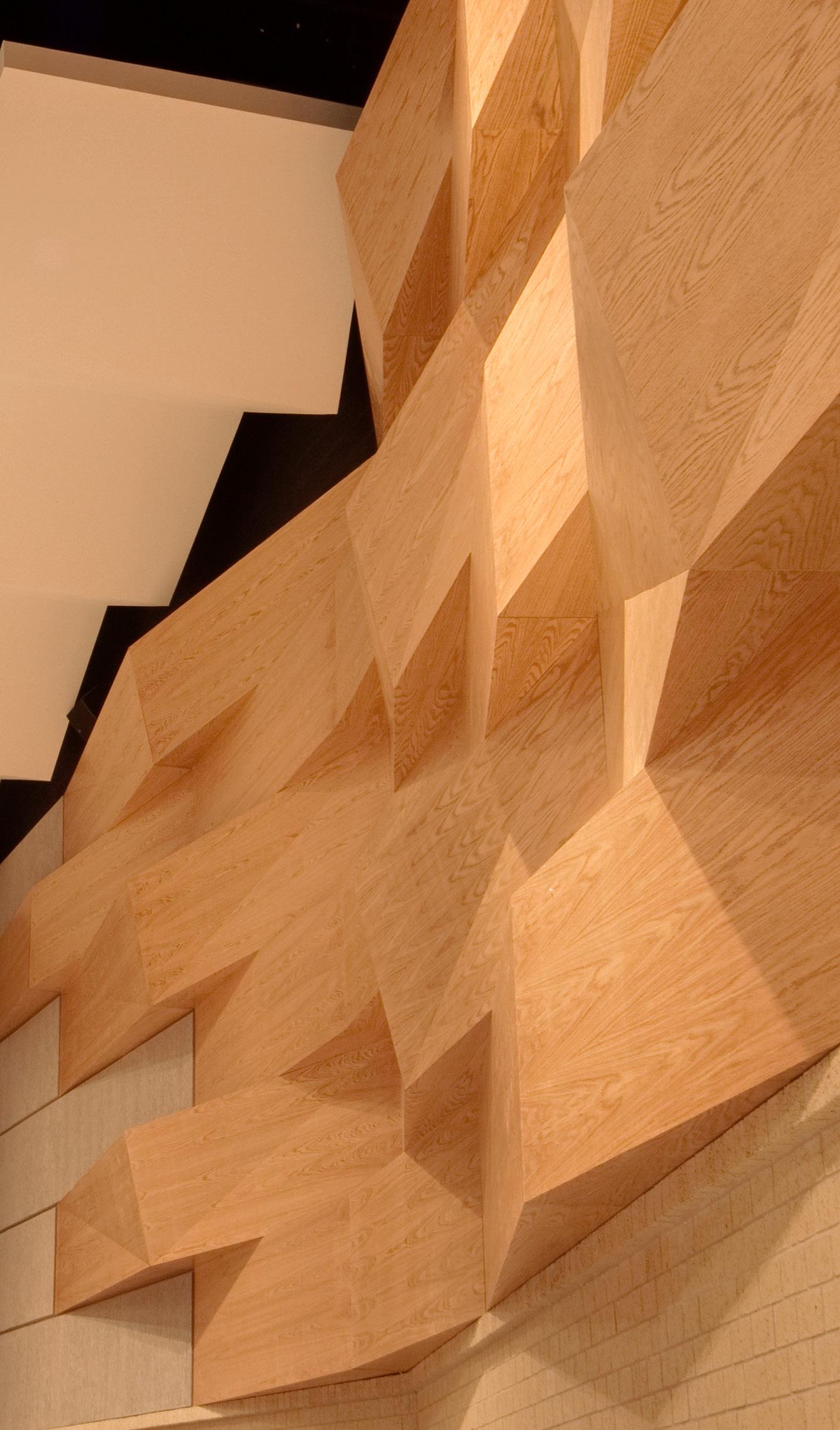 The central showpiece of the performing arts program is the 800-seat auditorium. An intricate basket weave pattern of wood panels create optimal acoustics and a stunning visual impression. The auditorium design received a special detail award from the Fort Worth Chapter of the American Institute
