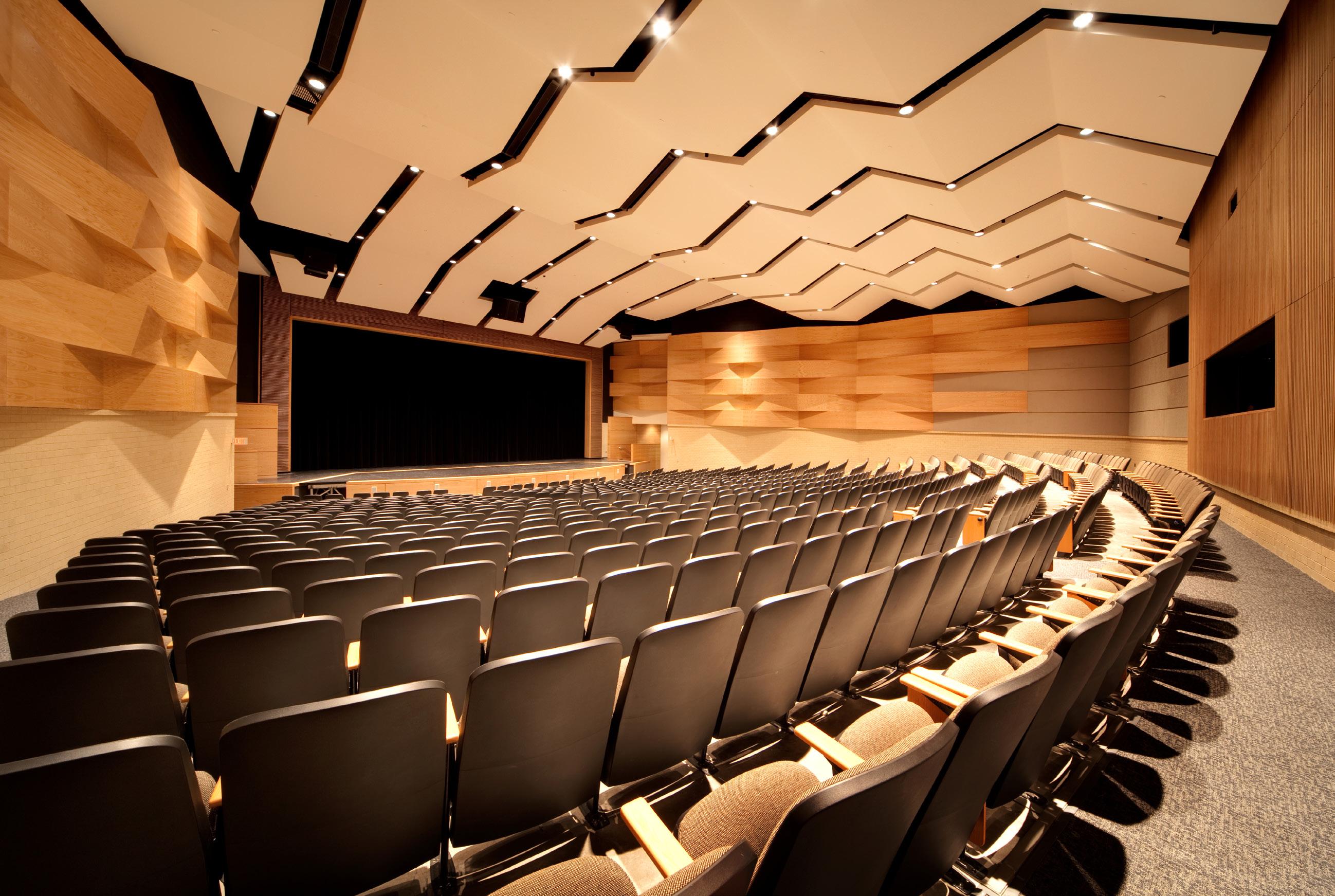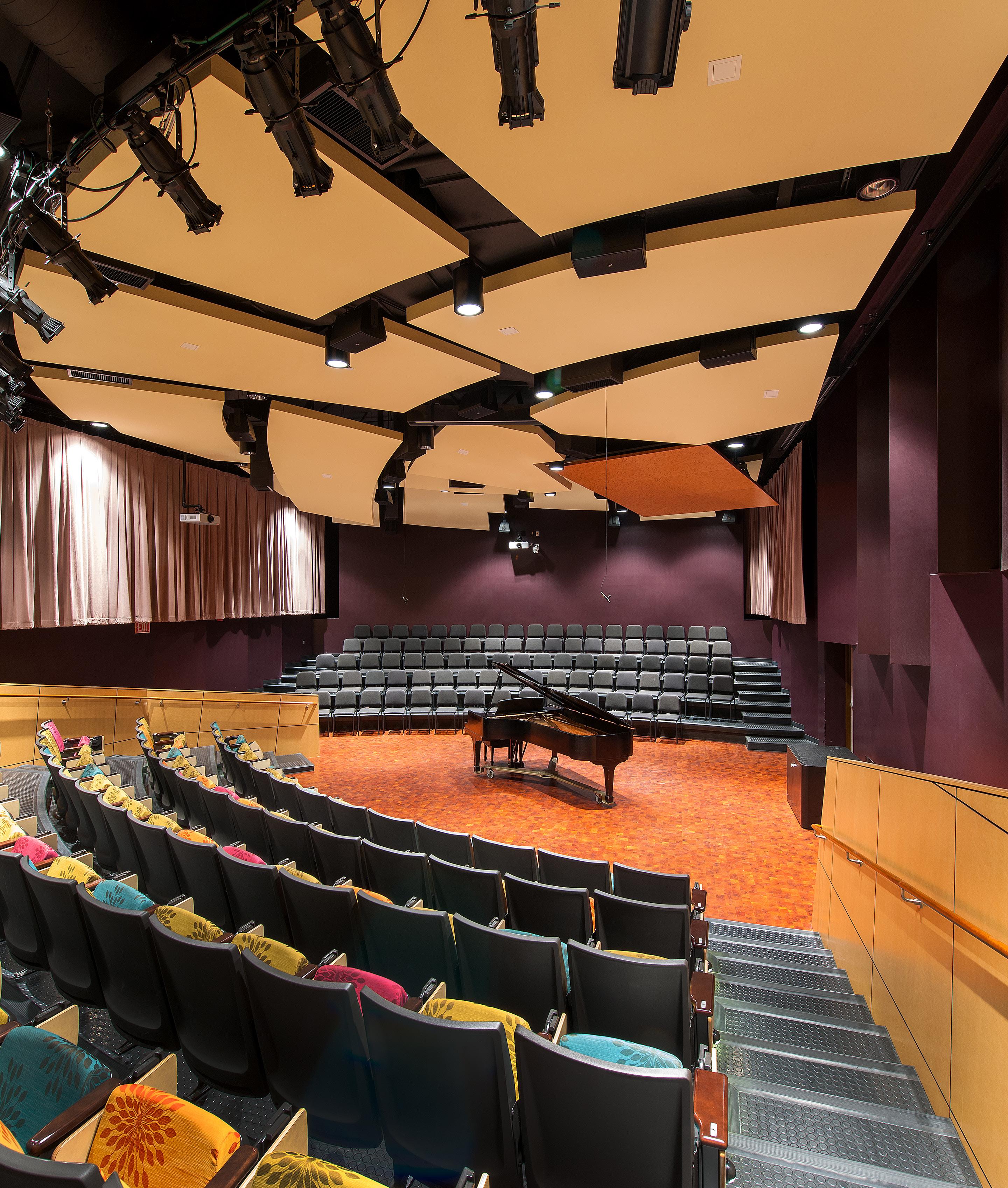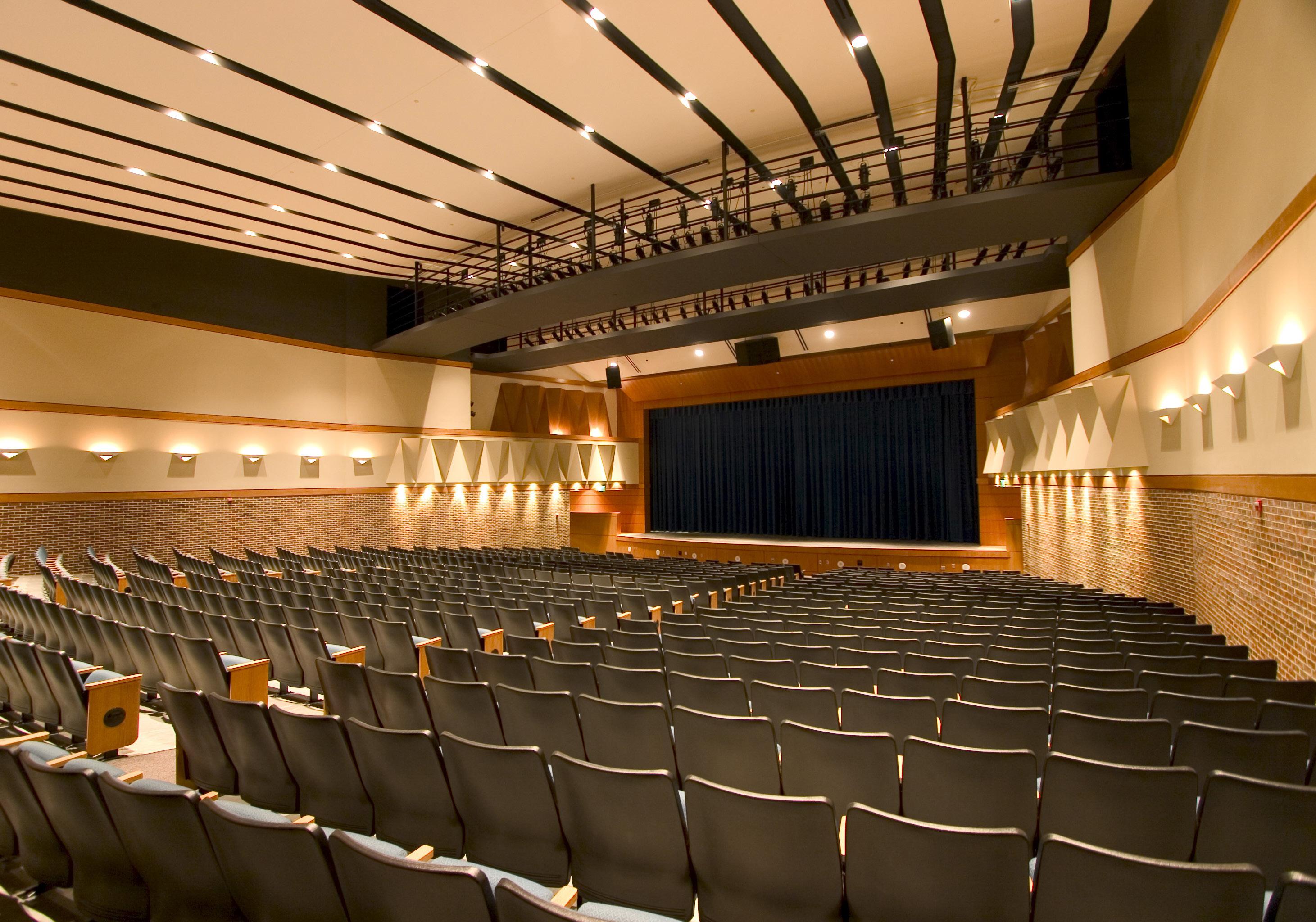 generous pre-function space includes a ticket booth and separate concession area. Visitors enter the auditorium through a pair of ramps that function as light and sound traps to eliminate interruption of performances when the lobby doors are opened, protecting both the student performers and the audience. Although the large stage includes a full orchestra pit, removable band shell, and a temperature controlled piano storage room. Support spaces include a dimmer and AV room, projector booth, follow spot rooms, and a lighting catwalk. The control room is designed large enough to accommodate an entire class of students, so lighting and sound board operation can be taught as well as managed throughout a production. A motorized rigging system on the stage provides optimal safety for student operation as well.