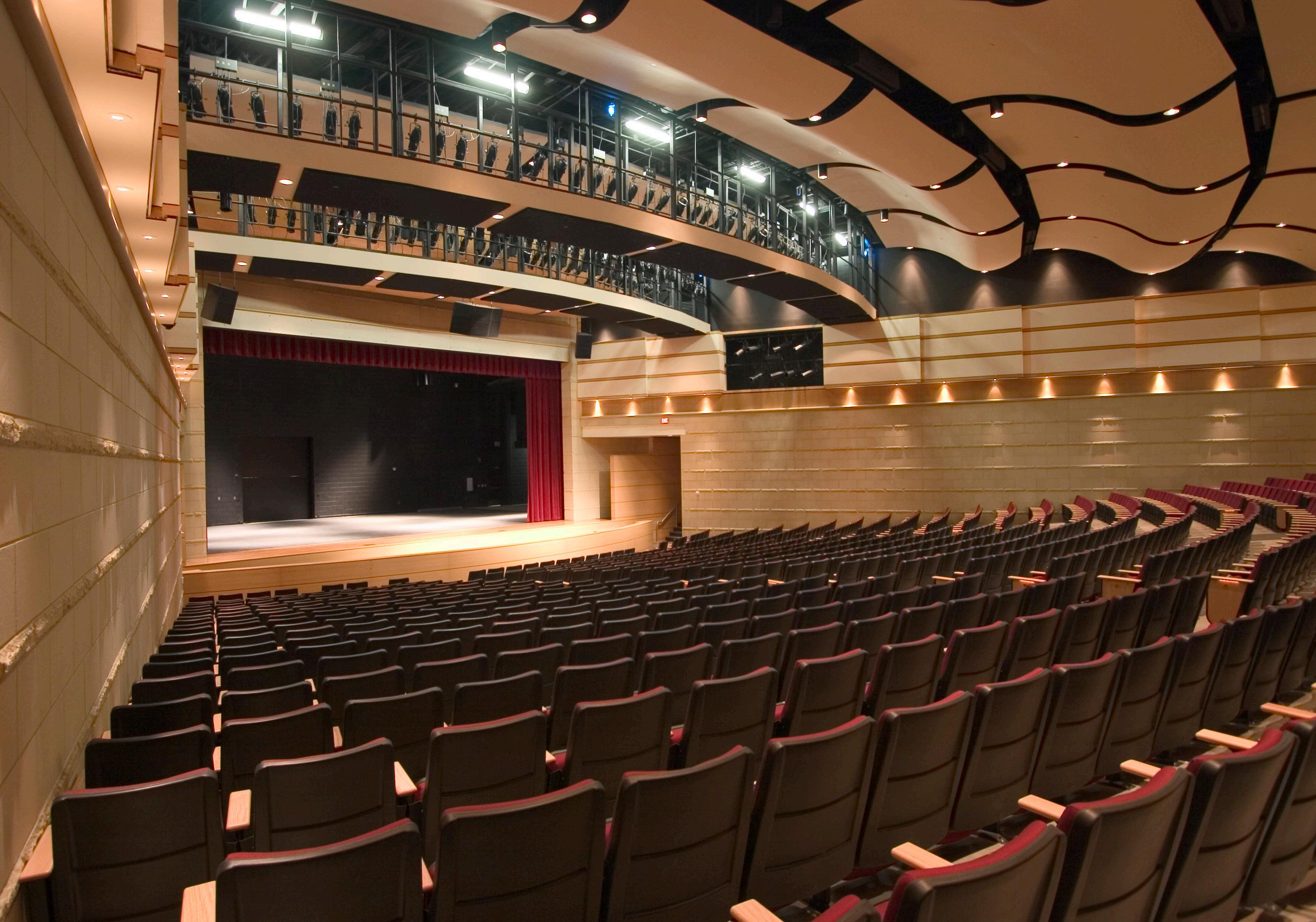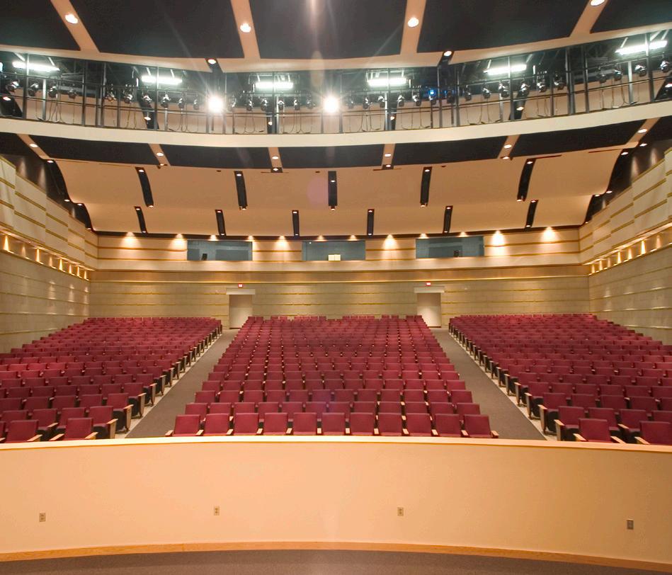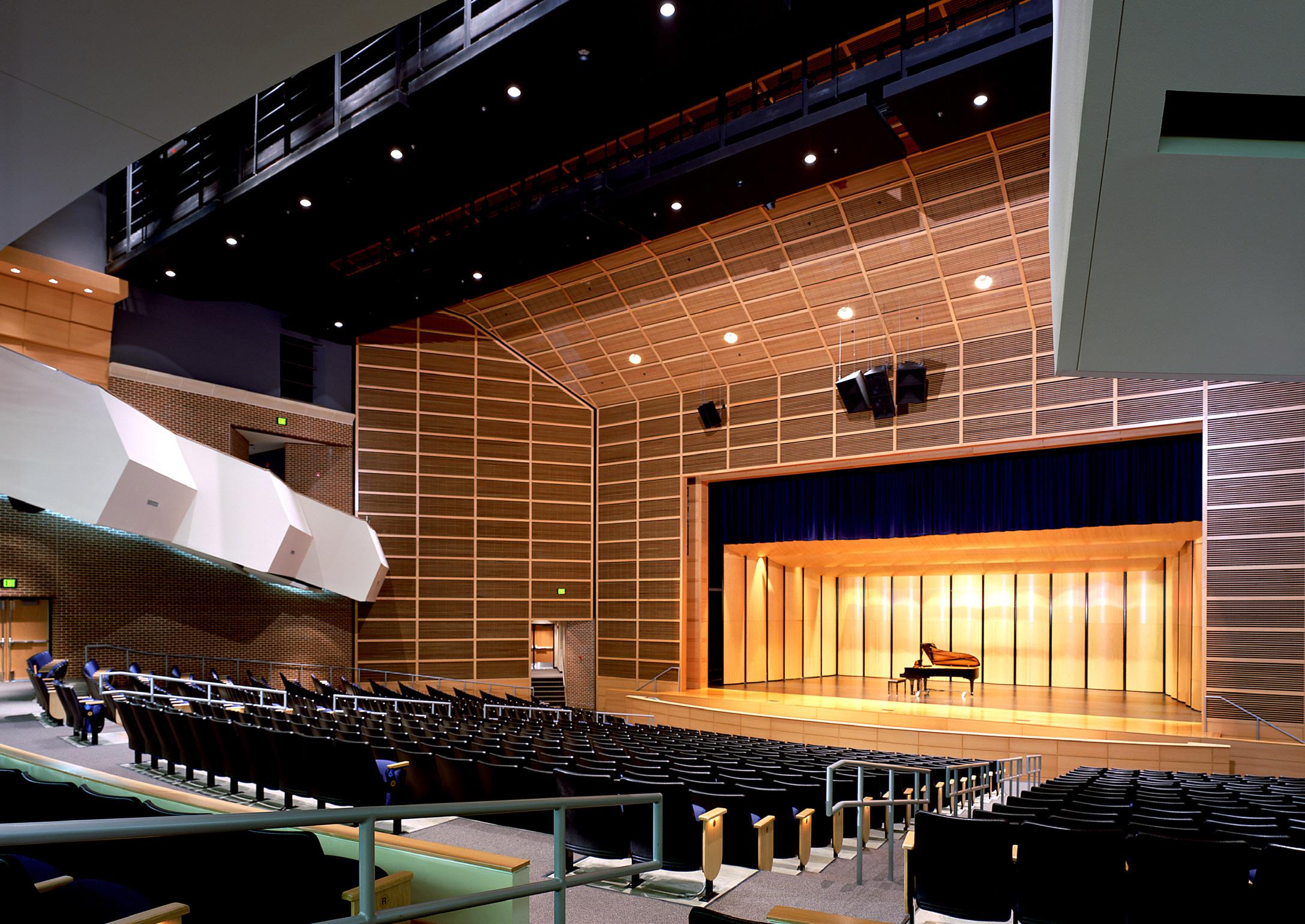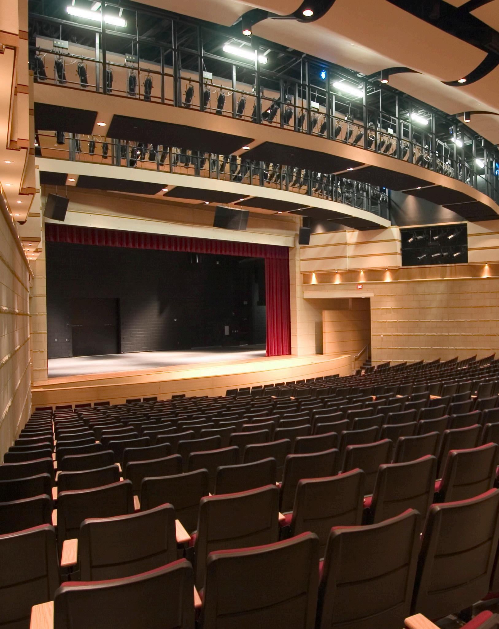 generous pre-function space includes a ticket booth and separate concession area. Visitors enter the auditorium through a pair of ramps that function as light and sound traps to eliminate interruption of performances when the lobby doors are opened, protecting both the student performers and the audience. Although the large stage includes a full orchestra pit, removable band shell, and a temperature controlled piano storage room. Support spaces include a dimmer and AV room, projector booth, follow spot rooms, and a lighting catwalk. The control room is designed large enough to accommodate an entire class of students, so lighting and sound board operation can be taught as well as managed throughout a production. A motorized rigging system on the stage provides optimal safety for student operation as well.