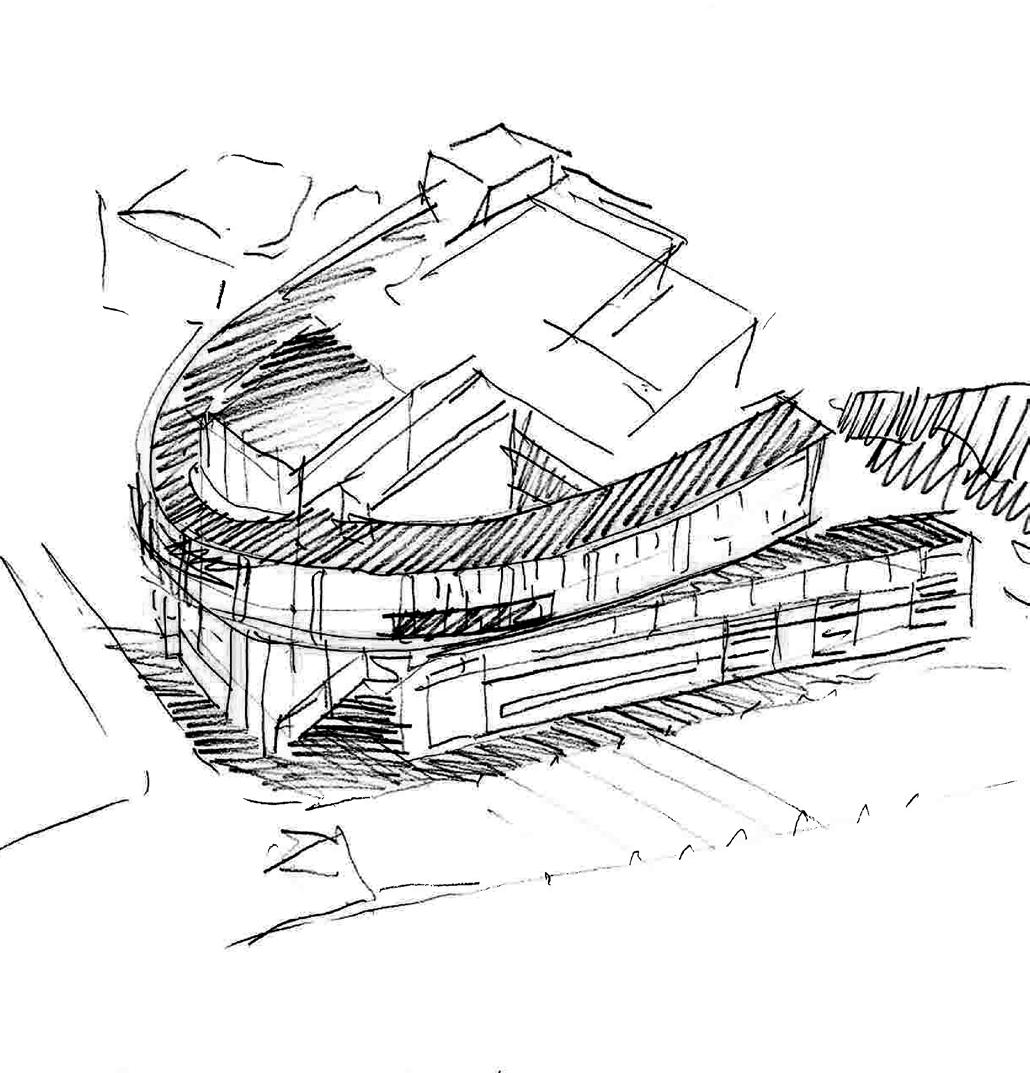 The site for the facility would allow for community integration with a plaza, adjacent streets, and the City of Fort Worth creating a shared environment for both students and adults. Great performance venues have the intentional expectation of a community experience, and this prospect led the design thinking of this project. Design decisions considered the streets that would feed the foot traffic existed in the city. Therefore, intentional traffic planning was achieved in order to suggest comfortable engagement with the street and a connection to the Academy as a part of the extended Cultural District. The lobby areas visually connect the street to the Academy beckoning entry with a monumental stair. Outside, a plaza stair creates an outdoor room and also serves as a performance space with tiered seating for the audience. When not in use for performance, this outdoor area is also appropriate for a casual lunch. Bordering streets also become a perfect place for street festivals and celebrations. The opportunities are limitless. Moreover, the suggestion of integrating the mission and intentions of the Fort Worth Cultural District could be supported. The architecture responds to the anticipated curricula, and works to support the deliberate function of the building. The massing articulates the program of spaces, and musicality is apparent in the exterior character of the building. Academic wings provide students views of the city. Thoughtful consideration was given to student parking and parent drop offs, as well as community parking for events. In all cases, patrons will experience the prominent entry to the facility. A single and clearly identifiable entry gestures access for the unique encounters that will be experienced, beginning with the vestibule which provides the connection to each specialized academy area, each with its own reception space.