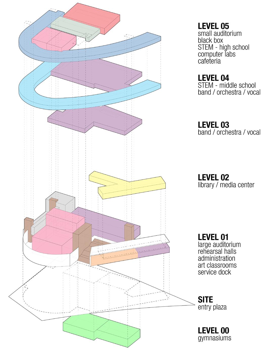 experience the arts at a high school level, the specialized areas that facilitate their instruction and performance should reveal the same levels of expertise that students have been working to demonstrate. Additionally, the environments should also support the community with an opportunity to encounter the talents acquired by students in a space conducive to performance and display.