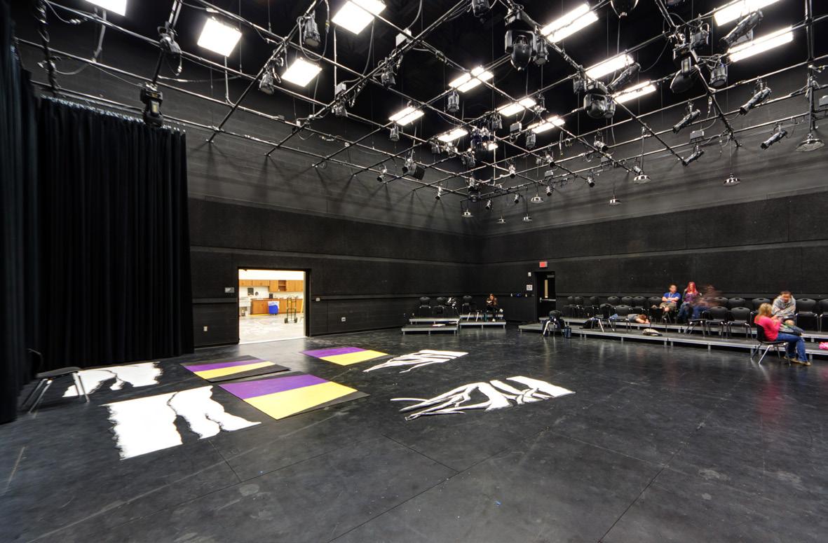 Large dressing rooms with mirrors, good lighting, and plenty of counter space are provided adjacent to the stage. The scenery shop is in an ideal location so it has direct access to an exterior loading dock as well as direct access to the stage and prop storage areas.