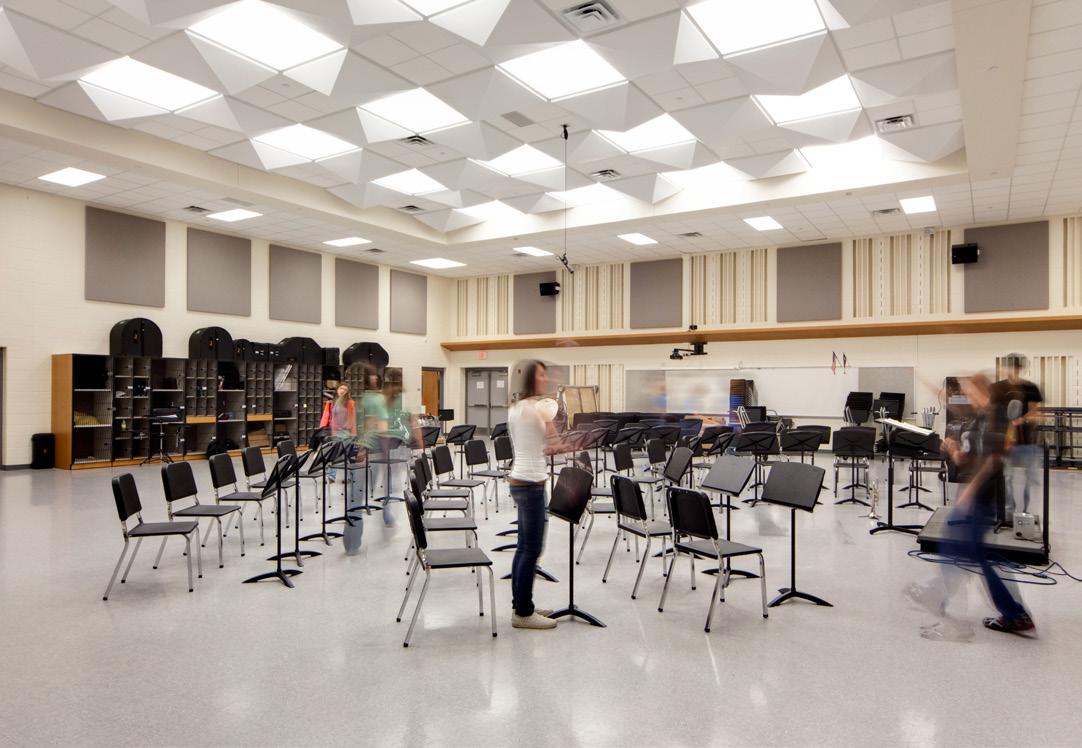 The band and choir areas feature large rehearsal spaces, large and small ensemble rooms, instrument and uniform storage, and sound-proof Wenger practice rooms. The drama program includes a flexible black box theatre, classroom, prop storage, costume storage, and dressing rooms.