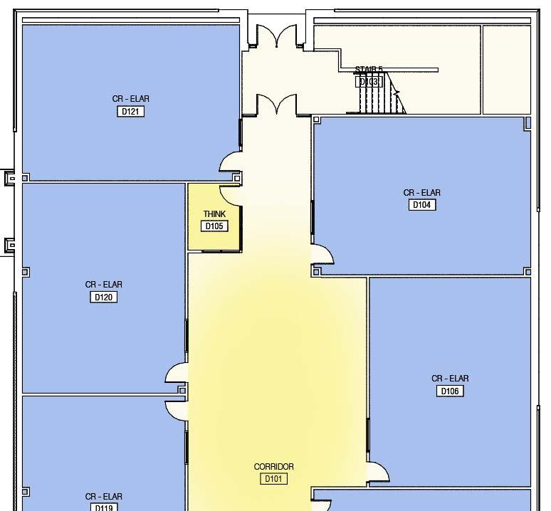 Each academic wing of the building includes classrooms, small (Think) and large (Exchange) collaboration areas, and teacher workrooms (Design Lab)