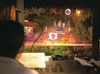 8:15: After a delicious dinner, including “to die for” desserts, guests make their way along torch-lit pathways to the outdoor theater, unaware that other guests have unobtrusively gotten off subsequent boats in time for the show. (These later arrivals enjoy the second seating for dinner after the finale.)
