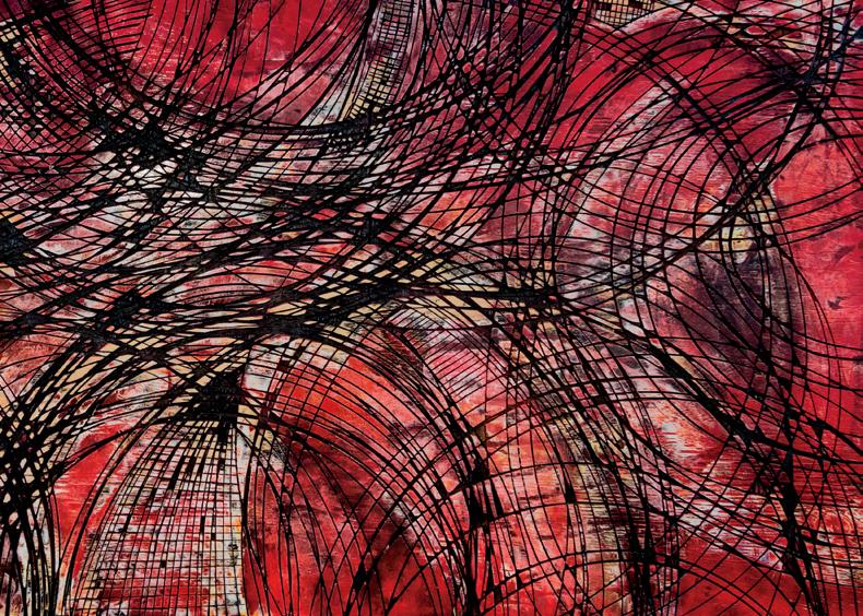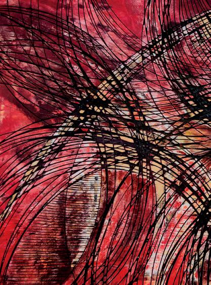 The intensity of the red color in this piece is all-pervading, thus its title. In this mixed media work, with a concave piece of wood used as a canvas, black lines of various thicknesses, going in different directions, ultimately come together, creating an almost chaotic and very organic effect.