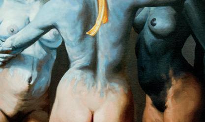 Esta obra pictórica del joven autor tapatío Diego Ayala, juega con el contraste de los colores y la luz, en un claro homenaje a la icónica pieza de Las Tres Gracias del maestro del barroco Rubens. En este cuadro, Ayala manifiesta el concepto filosófico del equilibrio cósmico en el que danzamos en círculos, recibiendo siempre de la vida para disfrutar y después compartir. Esto se representa con un juego de luces y colores: cada uno de los tres personajes es representado por un espectro de luz (claro, gris y negro) y el trío cromático primario (azul, amarillo y rojo). Gratias Agere es parte de una serie titulada “El eterno viaje del aprendiz”, que puede ser observada y adquirida en Galería Uno (Morelos 561, El Centro).
