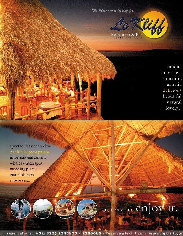 Green Green Greens, salads, sandwiches and juices. ensaladas, sándwiches y jugos. Plaza Caracol l-8-aa , Hotel Zone. Las Gorditas Norteñas special home-cooking from northern México, home delivery. Comida casera especial del norte de México; entrega a domicilio. Plaza Caracol l-7-aa , Hotel Zone. Fondue Fusion That fondue experience at linen-covered tables outdoors. Coma un fondue en mesas con manteles de lino en exteriores. I. l. Vallarta 130, e. Zapata. Vista Grill a sophisticated rendition of former sr. Chico’s gourmet menu. Una interpretación sofisticada del tradicional menú gourmet de sr. Chico’s. Púlpito 377, alta Vista. Sama 32 More than a sidewalk snack bar. Más que un lugar de bocadillos. olas altas 510, e. Zapata. Papaya 3 Huichol Vegetarian and Mexican menu, third location. Comida vegetariana y mexicana, 3a. locación. Morelos 737, el Centro. Kampai Japanese food and sushi bar. Comida japonesa y sushi. Rodolfo Gómez and olas altas, e. Zapata. Café Ixtlahuahuey neighborhood coffee shop. Cafetería regional. l ázaro Cárdenas 230- b, e. Zapata. Pastel du Village Genuine french pastry and take-out food. Genuina repostería francesa y comida para llevar. l ázaro Cárdenas 231, e Zapata. Gatos & Cats Daily menu, breakfast, lunch and dinner. Menú diario: desayuno, comida y cena. Hidalgo 222-a , el Centro. La Catrina Tacos, steak and wine house. Tacos, cortes de carne y cava de vinos. Galeana 104 - 101, el Centro. Vallarta Grill outdoor “campestre” family-style restaurant. Restaurante familiar estilo campestre. Carr. a Punta Mita, bucerías. Cenaduría Doña Raquel Downtown eatery of authentic Mexican cooking. o freciendo auténtica cocina mexicana. leona Vicario 131, el Centro. Paradise Bakery baked goods, featuring cinnamon rolls. Productos horneados, incluyendo rollos de canela. 5 de febrero, near Gutierrez Rizo, e. Zapata. Lazzard Mexican haute cuisine with a french touch, live jazz. alta cocina mexicana con un toque francés y jazz en vivo. Puesto del sol l-12-a / b, Marina Vallarta.
