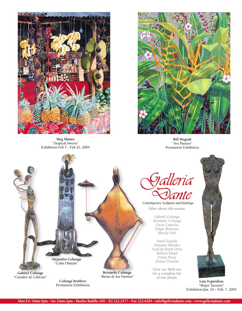 Abibe’s name change for clothing in natural fibers. Mina 169, el Centro. nuevo nombre para un lugar que ofrece ropa hecha de fibras naturales. Mina 169, el Centro. Amazing Mexico a museum about Mexico’s history offering products from Jalisco. Iturbide between Juarez and Morelos, el Centro. Museo sobre la historia de México que ofrece productos de Jalisco. Iturbide, entre Juárez y Morelos, el Centro. Antique Shop furniture, pianos, chandeliers, art and more. Colombia 1217, Hotel Zone. Muebles, pianos, candelabros, arte y más. Colombia 1217, Zona Hotelera. Bob’s Stop Home décor items. Guadalupe sanchez, el Centro. a rtículos para decoración de interiores. Guadalupe sánchez, el Centro. Encore Clothing consignment store. l azaro Cardenas 515, e. Zapata. Tienda de ropa a consignación. l ázaro Cárdenas 515, e. Zapata. Galeria Grosman s culpture by a lexander Grosman. fco. M. a scencio 1951, Hotel Zone. e sculturas por a lexander Grosman. fco. M. a sencio 1951, Zona Hotelera. Judith Ewing Morlan new location for contemporary art gallery. Corona 160, el Centro. nueva ubicación para esta galería de arte contemporáneo. Corona 160, el Centro. La Casa de los Encantos Gallery and boutique with art, clothing and accessories. a basolo 189, el Centro. Galería y boutique con arte, ropa y accesorios. a basolo 189, el Centro. Marco Castillo – Art in Glass Gallery. l ibertad 258, el Centro. Galería. l ibertad 258, el Centro. Ningún Pecado bathing suits, shorts, accessories and more. basilio badillo 278. e Zapata. Trajes de baño, shorts, accesorios y más. basilio badillo 278. e. Zapata. 8 y Más Galería Modern Mexican art gallery. Guerrero and Miramar, el Centro. Galería de arte mexicano moderno. Guerrero y Miramar, el Centro. Panico Gift Shop Colombia 1258, Hotel Zone. Party Land everything for special occasions. Peru 1303, Hotel Zone. Todo para esas ocasiones especiales. Perú 1303, Zona Hotelera. Unique Consignment Store furniture, antiques, rugs, porcelain and art. basilio badillo 429, e. Zapata. Muebles, antigüedades, tapetes, porcelana y arte. basilio badillo 429, e. Zapata.