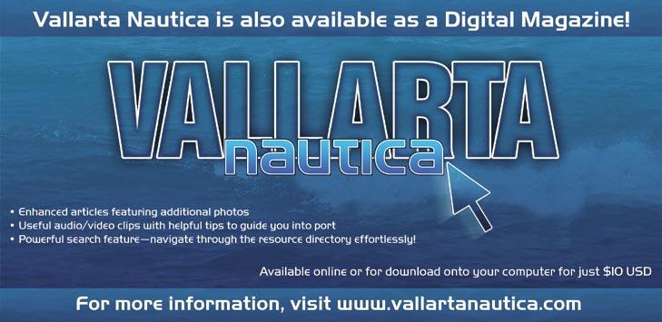 For a low fee of US$10.00, subscribers will be able to view the complete publication online or download it onto their computer. As well, additional images, even audio, can be added. Instead of just one photo of a certain area of the bay, we will be able to provide multiple images in slide show format. And by providing voice over, subscribers will have Vallarta Nautica on their laptop as they are coming into port, with the voice of Lew Jennings guiding them in! The digital format should be available in November and you will be able to access it at www.vallartanautica.com.