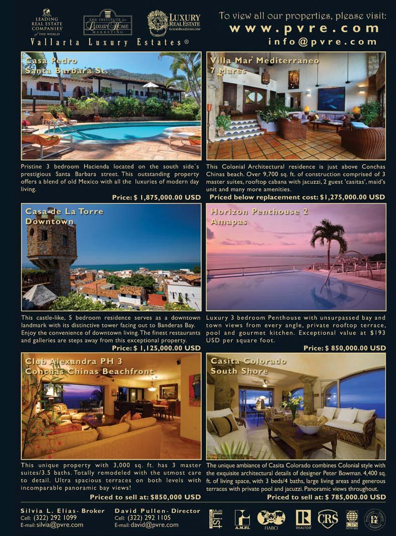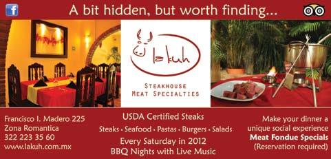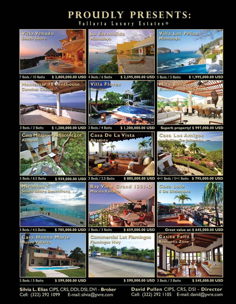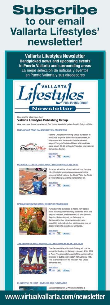 Puerto Vallarta Lifestyles, Invierno/Primavera, Febrero 1 del 2012. Revista trimestral producida independientemente pero con la colaboración de empresas en Bahía de Banderas. Producciones VIVA no asume responsabilidad alguna por información y/o fotografías proporcionadas por los anunciantes. Dicha información se asume como confiable de acuerdo a las fuentes de donde se obtiene. Se prohibe la reproducción total o parcial de esta revista sin el permiso expreso de JGY Servicios Profesionales, S.A. de C.V. Puerto Vallarta Lifestyles is a quarterly magazine, produced independently, but in cooperation with the business communities of Banderas Bay. Producciones VIVA assumes no responsibility or liability for the information and photos presented in this magazine for its advertisers. All information is deemed reliable from the sources from which it was taken. It is prohibited to reproduce, in total or part, any portion of this magazine without the expressed permission of the Vallarta LIfestyles Publishing Group.