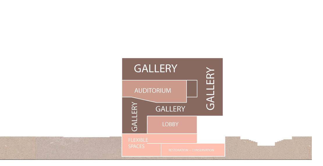 This portion of the parti holds the core programs of the building. The sectionreveals how movement flows fluidly through the floor plates, emphasizing the spatial relationships and continuity between each level.