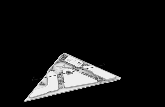 The idea behind this design is to create a site that naturally blends the fast pace of modern life with the peaceful, slower rhythms of rural life. The journey begins with a dynamic and vibrant atmosphere, positioned on the right, where the highenergy elements are situated. This includes the train station and arrival area, places that immediately immerse visitors in a fast-paced environment, reflective of urban progress and movement. These spaces are bustling with activity, capturing the excitement and energy of travel, as people arrive and move quickly through the space.