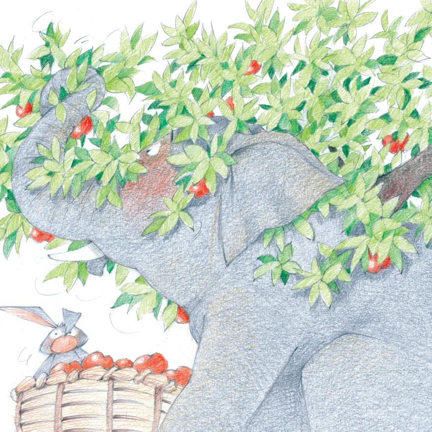 Un elefante al que se le ocurren muchas ideas curiosas y divertidas para hacer junto a su árbol favorito.