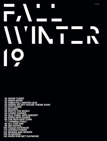 30 SHOW TUNES 32 VMAN NEWS 38 VMEN FALL/WINTER 2019 48 INSIDE AN ART-HOUSE THEME PARK 50 CITY GUIDE 54 BUZZED 56 WHO’S THE BOSS? 58 CARRY DIARIES 60 OLD TOWN, NEW SHERIFF 62 PARIS NEW GUARD 66 THE NEW NEW YORK 71 TURNING POINT 86 ALL FOR ONE 98 SKI PATROL 106 TOUGH EXTERIOR 116 STEREO POWER 122 BRAINS AND BRAWN 130 IN SEASON 140 WHEN KIM MET RAYMOND