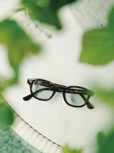 「下北沢のパリミキのお店 の前を通ったら、この多角 形フレームが目に入って。 この淡いブルーのレンズは 指定して入れてもらって入 れました。リムの内側にク リア樹脂が挟み込まれてい て、目元がキラッとするの がいい感じです」