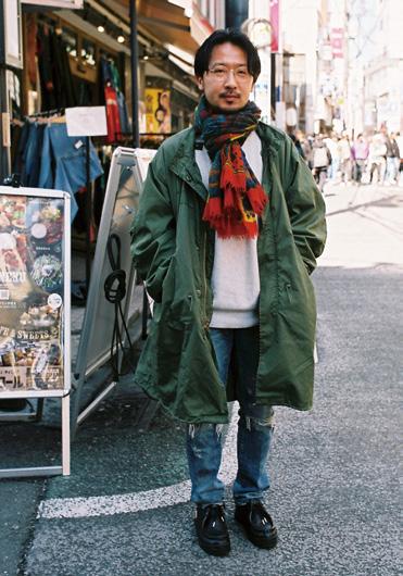 首からミラーレス一眼を下 げ、観光がてら古着屋巡り を楽しんでいるSHAWさ ん。「バブアーのビデイルに モスコットのレムトッ シュ、足元はニューバラン スは990。ベーシックな着 こなしが好きで、愛読書は Beginです」
