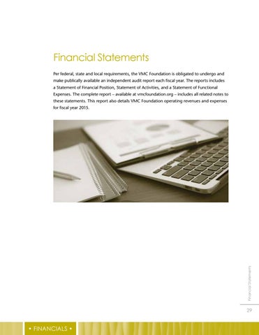 Financial Statements Per federal, state and local requirements, the VMC Foundation is obligated to undergo and make publically available an independent audit report each fiscal year. The reports includes a Statement of Financial Position, Statement of Activities, and a Statement of Functional Expenses. The complete report – available at vmcfoundation.org – includes all related notes to these statements. This report also details VMC Foundation operating revenues and expenses