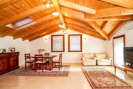 L'appartamento al piano superiore è una vera e propria casa padronale, con finiture di alta qualità come il pregiato parquet in larice , e vanta 185 mq composti da un salone con camino, una cucina abitabile, un loggiato coperto di 19 mq , due camere da letto e due bagni. Al piano terra, dal caratteristico portico di 26 mq, si accede ad altre