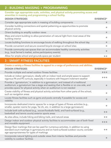 Consider age-appropriate scale in massing of building components Consider building connections and spatial patterning as opportunities to promote physical activity Orient building to amplify outdoor views Mass and orient building to allow penetration of natural light from most areas of the building interior Locate building functions to encourage bouts of walking throughout the school day Provide convenient and secure covered bicycle storage on school sites Provide community-use spaces that can accommodate healthy community activities (e.g., local farmer’s market, active participatory events) Allow for ample school and grounds space per student