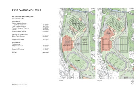 EAST CAMPUS ATHLETICS FIELD HOUSE / ARENA PROGRAM 2012 Campus Plan 10-year plan: Public / Support Spaces Lobbies, Restrooms Class / Meeting Rooms Fitness / Weights / Training Offices Athletic Locker Rooms Field House (2,500 Seats) 200m Track, Storage Support / Efficiency 15-year Plan: Future Arena 3,500 Seat Venue Support / Efficiency TOTAL: