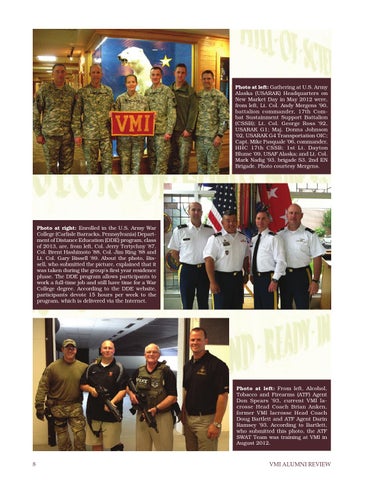 Photo at left: Gathering at U.S. Army Alaska (USARAK) Headquarters on New Market Day in May 2012 were, from left, Lt. Col. Andy Mergens ’90, battalion commander, 17th Combat Sustainment Support Battalion (CSSB); Lt. Col. George Ross ’92, USARAK G1; Maj. Donna Johnson ’02, USARAK G4 Transportation OIC; Capt. Mike Pasquale ’06, commander, HHC 17th CSSB; 1st Lt. Dayton Blume ’09, USAF Alaska; and Lt. Col. Mark Nadig ’93, brigade S3, 2nd EN Brigade. Photo courtesy Mergens.