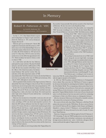 In Memory Boys and the Commonwealth Club and was a member of the State Board of Education. He also was active in the Republican Party. Patterson was an ardent supporter of his alma matter, once saying that by Scott E. Belliveau ’83 VMI “has meant everything to me.” In 2001, the late Senator Elmon T. Director of Communications, VMI Foundation Gray ’46 said of Patterson’s devotion to VMI, “Bob Patterson has a depth of feeling about VMI – what its mission has been On July 12, 2012, New Market Medal recipient and should be – and a degree of loyalty to VMI, his and a leading figure in Virginia’s legal community, Brother Rats and his other VMI friends that very few Robert H. Patterson Jr. ’49C, died in Richmond, people can match.” It is not a surprise, therefore, that Virginia. He was 85. Patterson compiled a commendable record of service Patterson grew up in Richmond’s Church Hill to it. He served as president of The VMI Alumni Asneighborhood and matriculated from there in 1944. sociation, Inc., from 1963-66 and was a member of In his senior year at John Marshall High School, he the VMI Board of Visitors from 1968-77, serving at was the first captain of that school’s renowned corps its president in 1976 and 1977 –during which time he of cadets. He left the Institute in 1945 and served was an ex-officio member of the VMI Foundation’s in the U.S. Navy from 1945-46. At the end of his Board of Trustees. naval service, he was offered an appointment to the He is perhaps best known for his role as VMI’s chief U.S. Naval Academy but turned it down in order counsel during the six-year legal battle concerning to return to VMI. VMI’s status as a single-sex institution that took place As a cadet before and after the war, Patterson in the 1990s. Although Patterson and his team were participated in many activities. He played football successful in U.S. District Court and in the 4th U.S. and polo, ran track and was a staff member of The Circuit Court of Appeals, the U.S. Supreme Court Cadet. He also was a member of the Honor Court, decided in the favor of the U.S. Justice Department. Patterson ’49C the Officer of the Guard Association, the InternaOf Patterson’s leadership during the court case, VMI’s tional Relations Club and the Lectern Club. An superintendent at the time, Josiah Bunting III ’63, said, indication of the often topsy-turvy nature of VMI “Bob Patterson gave everything he had, because he immediately after World War II can be found in the fact that Patterson believed in VMI. He conducted himself like an honorable man, in accord served as vice president of the class of 1948A and as historian of the with the highest standards of the Institute.” class of 1949C, although not concurrently. In 1983, the VMI Foundation awarded Patterson its Distinguished After he graduated with a bachelor of arts degree in history, Patterson Service Award. Nine years later, the VMI Board of Visitors recognized attended the University of Virginia’s School of Law. There, he made the his devotion to the Institute by awarding him the Institute’s highest honor, Law Review, was elected president of his class and graduated in 1952. the New Market Medal. The accompanying citation praised him for his In July 1952, he joined the Richmond, Virginia, law firm, McGuire, “national leadership in the profession of law and in his community and Eggleston, Bocock & Woods, as its ninth lawyer and third associate, among VMI men; for his devotion to country, the commonwealth of Virworking from a desk in the firm’s law library. He would spend his ginia and to Virginia Military Institute; for his sense of honor, fair play and entire legal career of almost 50 years with the firm – now known as justice to all with whom he has been associated; and for his outstanding McGuireWoods LLP. performance of duty to his fellow citizens as a distinguished attorney.” Patterson was renowned as a formidable courtroom advocate and After his retirement, Patterson involved himself in charitable activities tough negotiator and played prominent roles in many high profile and continued his avid pursuit of hunting and fishing. cases, including a 1970s case about anticompetitive practices, for He is survived by his wife, Anne Marie Whittemore, a McGuireWoods which the $45 million settlement was then the largest such settle- partner who was involved in the VMI defense. He also is survived by his ment in U.S. history. He also is credited with transforming his firm son, Robert H. Patterson III; two daughters, India Gregory and Margaret McGuireWoods LLP from a small regional firm to a nationally Mansfield; a stepson, Robert P. Whittemore; seven grandchildren; and recognized firm with offices in eight states, the District of Columbia a step-grandchild. He was predeceased by his wife of nearly 50 years, and three foreign countries, employing more than 900 attorneys. He Luise Wyatt Patterson. served as the firm’s chairman from 1979-89, and he retired from Patterson is being honored at VMI through the Robert H. Patterson Jr. the firm and law on Dec. 31, 1999. He received many professional ’49C Scholarship. To date, the VMI Foundation has received an extraordihonors, including his election as president of the Bar Association nary number of gifts to this scholarship’s endowment, a sure indication of of the City of Richmond and the Virginia State Bar, as well being the high esteem in which he was – and is – held by his colleagues, fellow named a fellow of the American Bar Association and the American alumni and friends throughout Virginia and the country. College of Trial Lawyers. Active in civic affairs, he served as president of the Virginia Home for