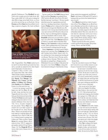 Brother Rats, 24th. Congrats Kurt. Chris Pettit reached out to I hope this issue finds everyone well. Things me and let me know that he got married in June have been hectic on my end this summer as your and is currently an analyst for the State DepartReunion Committee has been working hard to ment’s Diplomatic Security Service. try and ensure a wonderful reunion Congrats to Chris, as well. I was experience for all of us this coming also married this May 26th to Kate October. By the time you start receivWalter Dudley. Alumni in attendance ing this copy of the notes, however, were as follows; Adam Rosenbaum, our reunion weekend will most likely Kyle Rosch, Tyler Monger, Dan be a thing of the past, and I hope that Wilmoth, Mike Carney, Seth Enwe all have fond memories of a great terline, Jon Kelton, Mike Werner, time spent catching up with BRs we Mark Searles and Reid Dudley ’71. haven’t seen in a long while. It was a lot of fun and a hot one. Also on my end, in July I gave birth to my daughter, Brooklynn I received an exciting e-mail from Marie Bushore, who was born July happy new dad Joey Zyra. He and 19, 2012. My husband and I have his wife, Susan, had their first child, already started arguing about whether Virginia Brooke Zyra on June 7, 2012. she’s going to be a VMI cadet or if I also got a Facebook note back on May she’ll take the easy way out and go 17th that Will Davis was in the hospital to the academy, but I think that if she waiting for their first child to be born. has any sense whatsoever, then the Annalee McKenzie Davis was born decision will be simple. 7 lbs., 5.8 oz., 20 inches. Congrats to Russ Henriet and his wife, Stephathe new parents. Wilson Nance also nie, also welcomed a new baby this reached out to me with a picture of year! Russ writes that he and his wife his 8-month-old son, Jaxon Thomas had a new baby girl, Charlotte Erika Nance. Wilson’s son and wife are back Henriet, on July 2, 2012, at 2:58 p.m. home while he is with the Marine ExShe was 6 lbs. 5 oz., 18 inches long peditionary Force Chief of Staff, and and was born in Tacoma, WA. Russ he is looking forward to getting back says that he got to deliver his daughto them soon. While over there, Gunny ter and so far she is doing great! Driver the assistant Marine officer Mira Veis is adding to her family, instructor from 2009-11 organized a as well. She gave birth to a new get-together with the XO and Wilson, daughter, Aralyn, and says that her Gunny, Col. Tim Fitzgerald ’83 and Class of 2007: Josh and Heather Prible at their wedding 2-year-old son, Aiden, loves her to various other years of alumni were in in Santorini, Greece. death. She has lived in Falls Church, attendance.