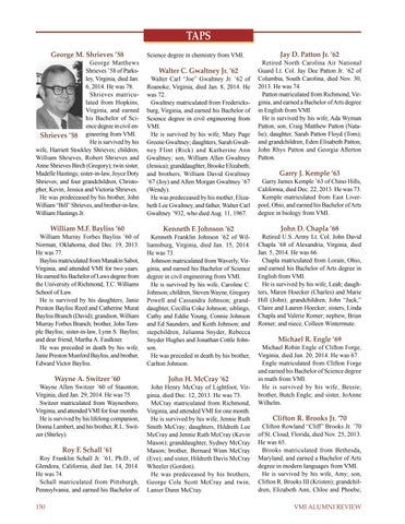 George Matthews Shrieves ’58 of Parksley, Virginia, died Jan. 6, 2014. He was 78. Shrieves matriculated from Hopkins, Virginia, and earned his Bachelor of Science degree in civil enShrieves ’58 gineering from VMI. He is survived by his wife, Harriett Stockley Shrieves; children, William Shrieves, Robert Shrieves and Anne Shrieves Birch (Gregory); twin sister, Madelle Hastings; sister-in-law, Joyce Doty Shrieves; and four grandchildren, Christopher, Kevin, Jessica and Victoria Shrieves. He was predeceased by his brother, John William “Bill” Shrieves, and brother-in-law, William Hastings Jr.