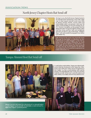 North Jersey Chapter Hosts Rat Send-off On Aug. 8, 2015, the North Jersey Chapter hosted a rat send-off at the Summit New Jersey Elks Lodge 1246. In their largest send-off event, more than 60 alumni, parents, friends, current cadets and matriculating cadets were present. John Lane ’68 spoke on the founding of VMI, the meaning of Col. J.T.L Preston’s inscription on the parapet and the things that make VMI special. Eight incoming cadets from New Jersey and New York were recognized, and each was given a copy of the book, “Virginia’s Ring,” with a personalized autograph from author Lynn Seldon ’83. Left: Pictured at the event were, from left, Kevin Sincavage ’87, Ken Kalisky ’73, John Bove ’19, Maxwell Horowitz ’19, Eddie Gloeggler ’14, Alec Vasi ’19, Kishan Patel ’19, Nicholas Zimmerman ’19, Jacob Ferraro ’19, Spencer Balsom ’19, Tyler Bernero ’19, Rick Wolffe ’78, Andy Tunnard ’89, Matt Lazzarotti ’18, John Lane ’68, Joe Riccadonna ’18, Nick Celfo ’18 and Brian Holt ’08. Present but not pictured was Robbie DiDomenico ’07.