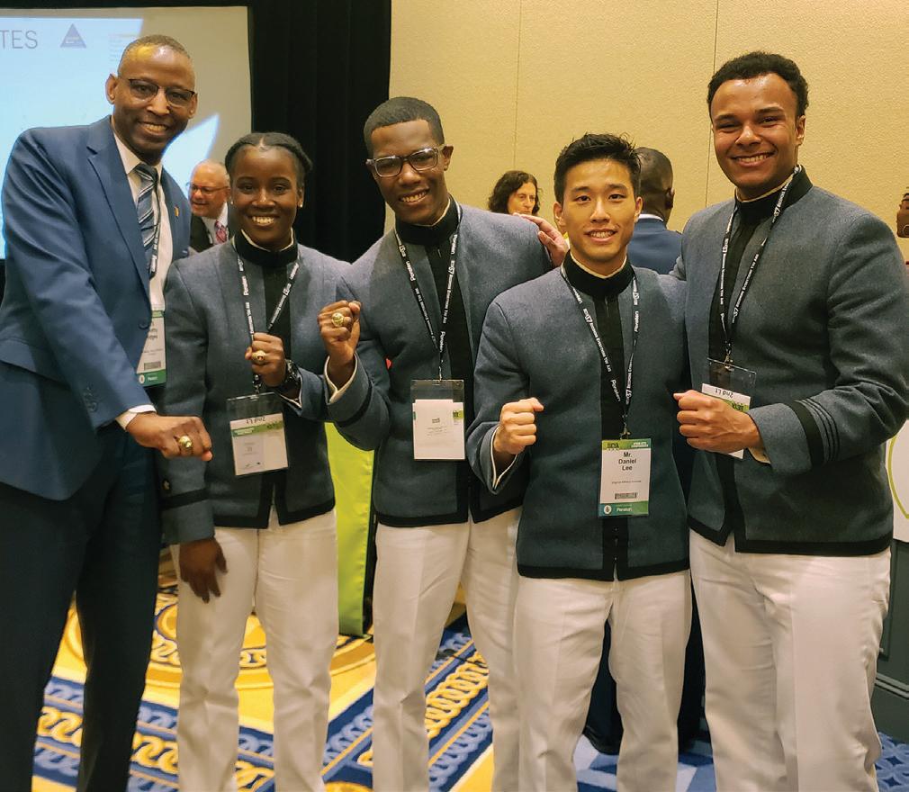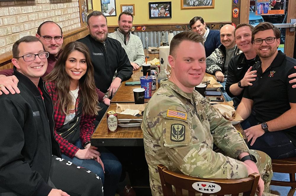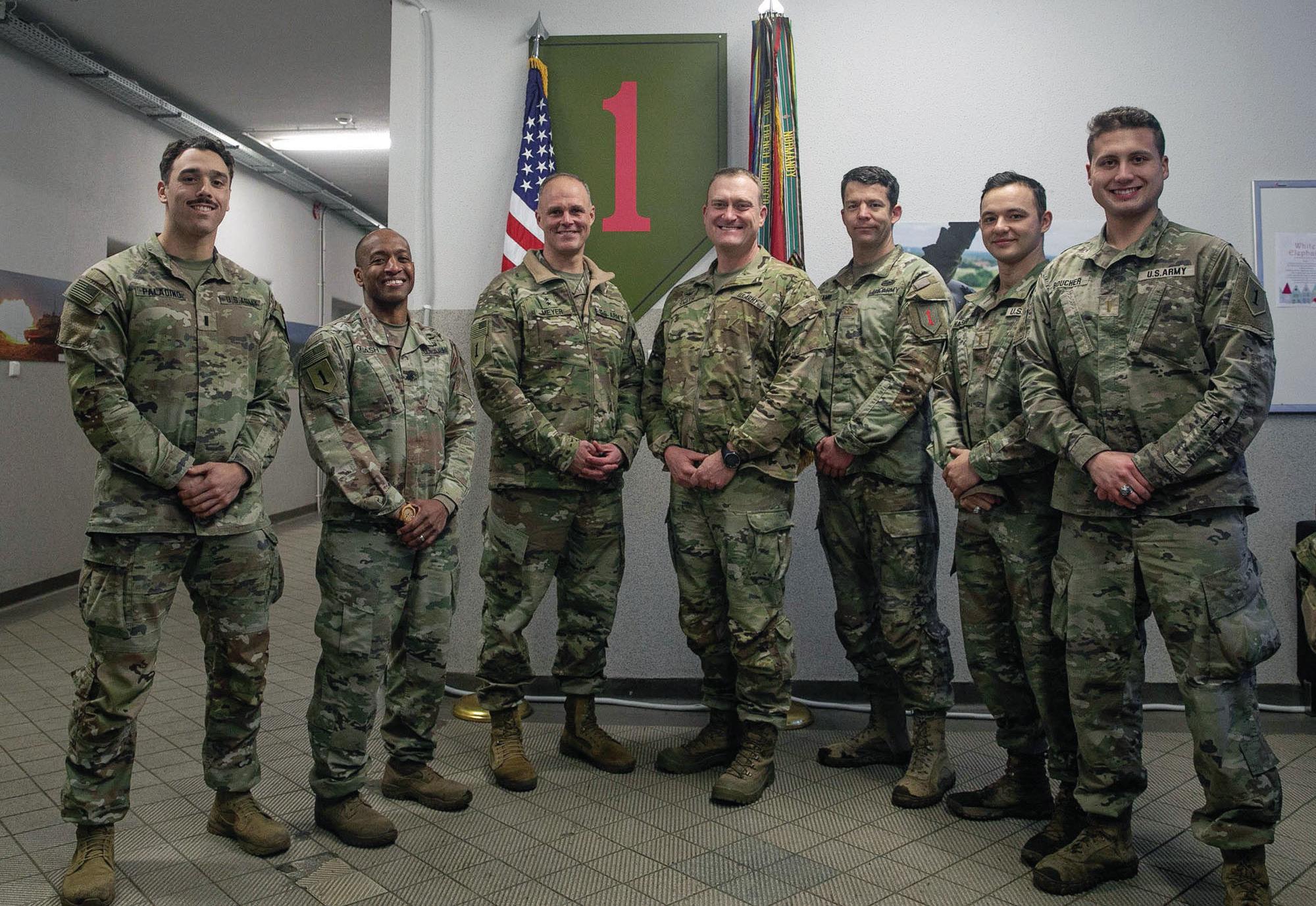 Pictured in February 2023 are (from left) U.S. Navy Lt. j.g. Robert Fricke ’19, U.S. Navy Lt. j.g. Nikolos Van Leer ’19, U.S. Marine Corps Capt. William Thomas ’17, U.S. Navy Cmdr. Dennis Harbin ’08, U.S. Navy Lt. Nicolette Huntley ’17, and U.S. Navy Lt. Cmdr. David Gately ’11.