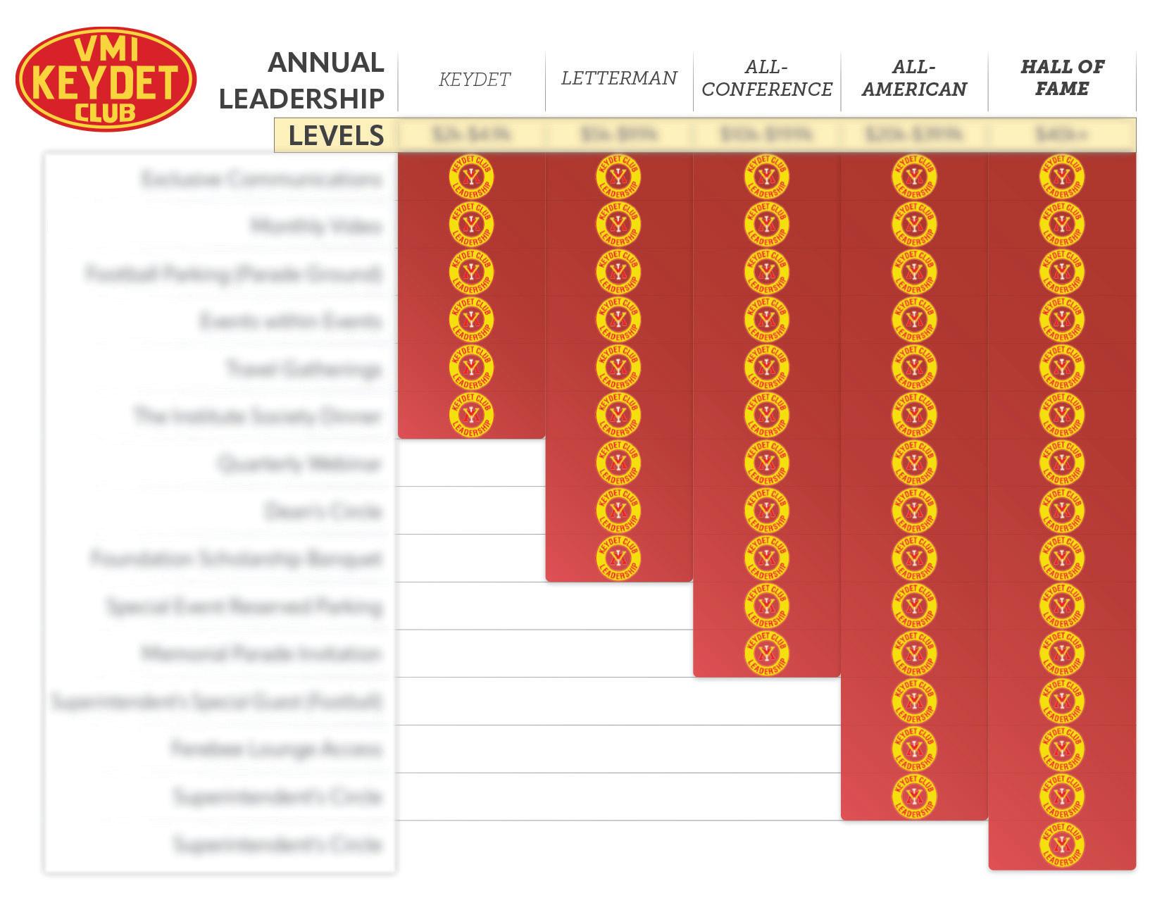 Responsible for the financial support of NCAA Division I cadetathletes via scholarships, coaches’ salaries, academic support, and operating budgets for VMI’s 18 individual NCAA teams. The Keydet Club provides directed communications to donor leadership and supports engagement at sporting events. Financial support from the Keydet Club creates opportunity for cadet-athletes.