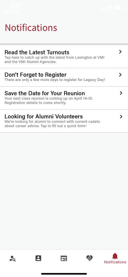 Exciting VMI Alumni Mobile App Updates Are Here! Everything in one place— from news to socials! New push notifications keep you in the know! Search for alumni by chapter and employer! Finding BRs and other alumni just got a lot easier! To download the app, scan the QR code with your smartphone or tablet camera or visit vmialumni.org/mobileapp Stay Connected with the VMI Alumni Mobile App *
