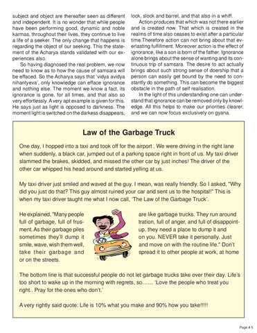 Law of the Garbage Truck One day, I hopped into a taxi and took off for the airport . We were driving in the right lane when suddenly, a black car, jumped out of a parking space right in front of us. My taxi driver slammed the brakes, skidded, and missed the other car by just inches! The driver of the other car whipped his head around and started yelling at us. My taxi driver just smiled and waved at the guy. I mean, was really friendly. So I asked, "Why did you just do that? This guy almost ruined your car and sent us to the hospital!" This is when my taxi driver taught me what I now call, ‘The Law of the Garbage Truck’. He explained, "Many people full of garbage, full of frusment. As their garbage piles sometimes they’ll dump it smile, wave, wish them well, take their garbage and or on the streets.