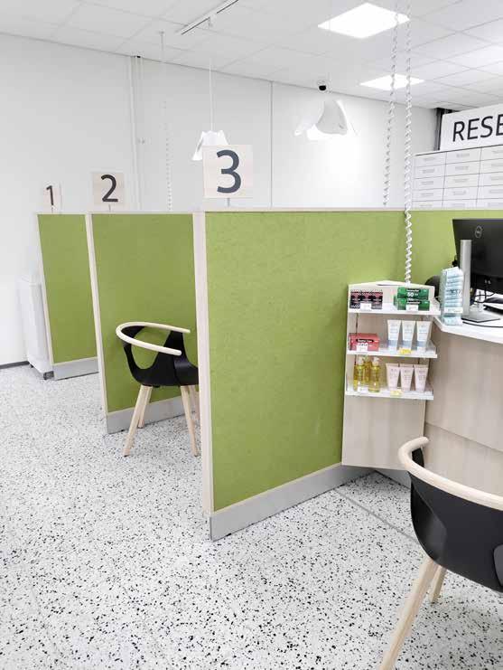 Toteutimme tammikuussa Sepänkylässä toimivaan Mustasaaren apteekkiin kalustepäivityksen. Apteekin aiemmat valkoiset, lasisilla yksityiskohdilla varustetut suoratoimitustiskien väliseinät päällystettiin pehmeän harmailla akustiikkalevyillä. Seinäkkeiden kokoa myös kasvatettiin aiemmasta, jotta saatiin pehmennettyä äänten kantautumista tilassa.